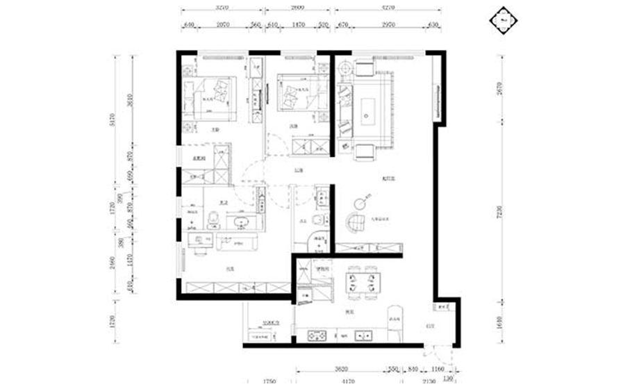 客廳:主要原有電視背景墻凹進(jìn)一塊,電視墻狹小問題,通過裝飾手段把背景拉伸