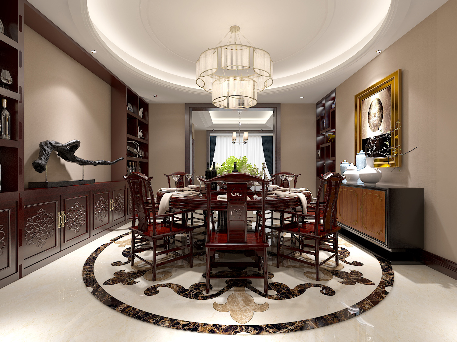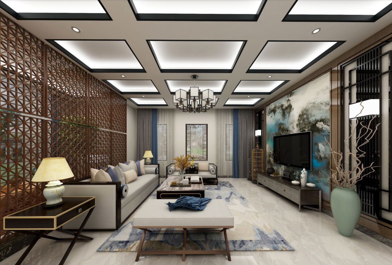 本案中的360平米的三居室整體采用了新中式風(fēng)格裝修,新中式風(fēng)格的設(shè)計(jì)不拘泥于傳統(tǒng)的中式元素,而是在繼承古典的基礎(chǔ)上融入現(xiàn)代的特色,將兩者有機(jī)地統(tǒng)一起來(lái),作品表達(dá)出現(xiàn)代人對(duì)于中式風(fēng)格低調(diào)沉穩(wěn)的精神境界的追求。