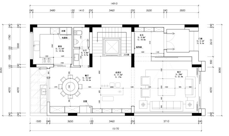 一樓:通過改造擴大了餐廳面積,同時新設(shè)了茶區(qū)的功能。色彩和材質(zhì)的搭配讓整個空間更明亮干凈。