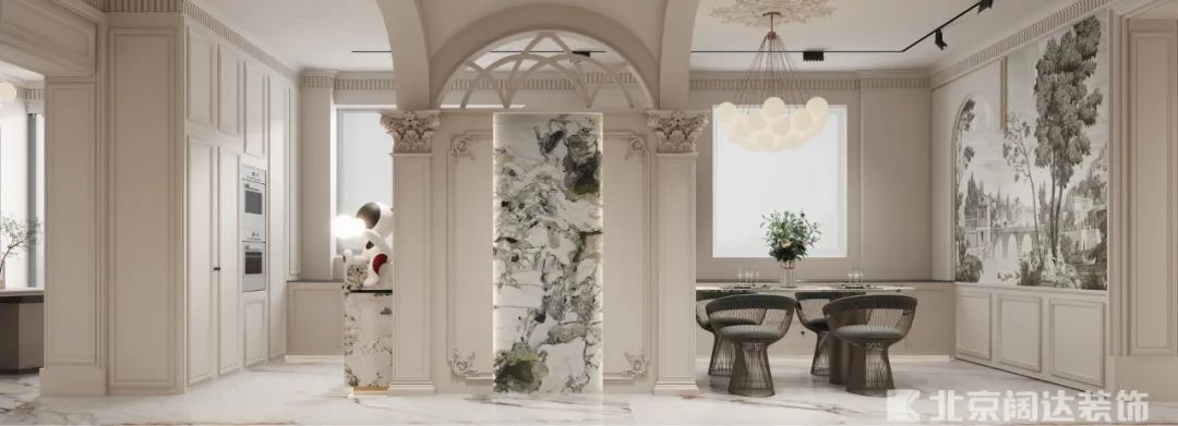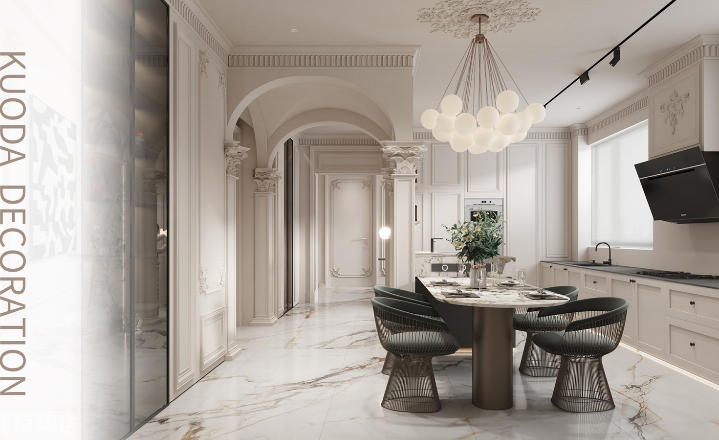 人間浪漫不過(guò)日出東方。把日出定格家中,一餐一食,皆溫柔。延續(xù)客廳的浪漫基調(diào),復(fù)古的壁畫為餐廳融入美好氛圍感;絲絨與羊羔絨餐椅將法式的優(yōu)雅完美表達(dá)。在功能上,增加島臺(tái)與餐邊柜,安裝小水槽和直飲機(jī),縮短生活動(dòng)線,提升家居舒適度。