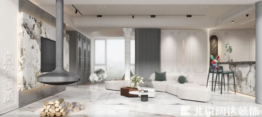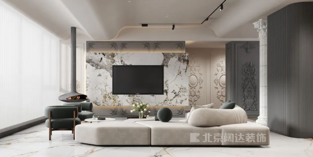 嵌入式設(shè)計(jì)的電視背景墻,結(jié)合巖板和法式線條護(hù)墻板,懸掛壁爐浪漫又不失質(zhì)感,既保留了法式的柔和,也融入了現(xiàn)代的大氣。圓弧形的吊頂上,嵌入式無(wú)主燈散落在“星盤”里,給予生活最自然浪漫的光影支持。