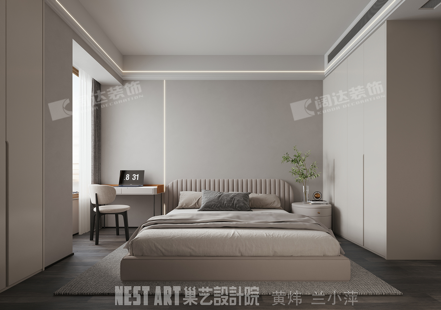 設(shè)計(jì)師在設(shè)計(jì)時(shí),將主臥劃分成睡眠區(qū)和衣帽間。將主臥的靠窗部位做成睡眠區(qū),把床頭背景墻的位置用造型調(diào)平,將邊角位置做成了衣帽間,增加了衣柜及儲(chǔ)物量,調(diào)整整個(gè)臥室空間的方正性,從而大大利用整體空間。