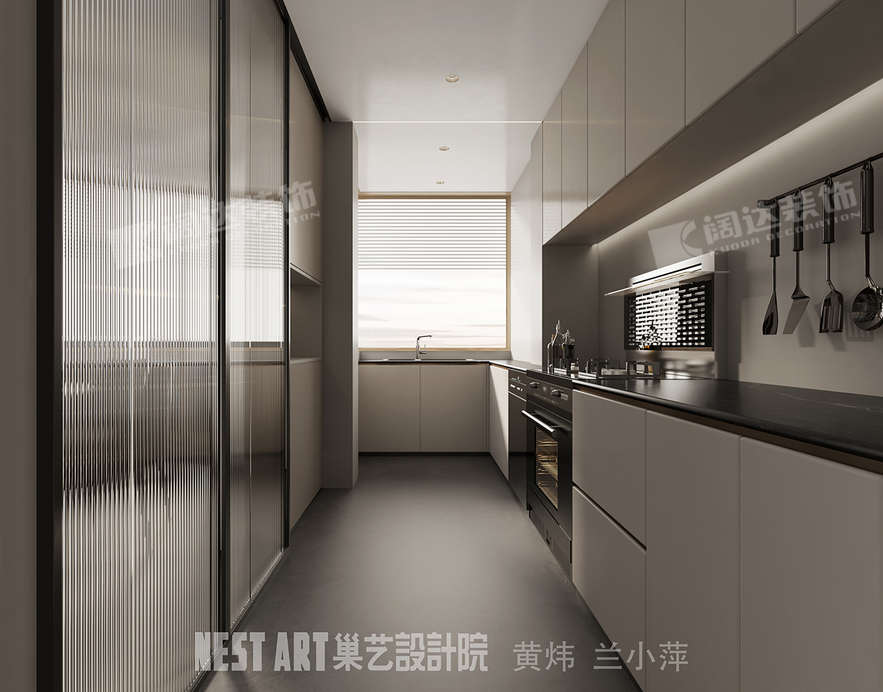 廚房區(qū)設(shè)計(jì)隱藏式推拉移門,增加了餐廚區(qū)空間延展性,也使烹飪空間更加靈活,餐廳區(qū)域空調(diào)冷氣使得廚房更加舒適。