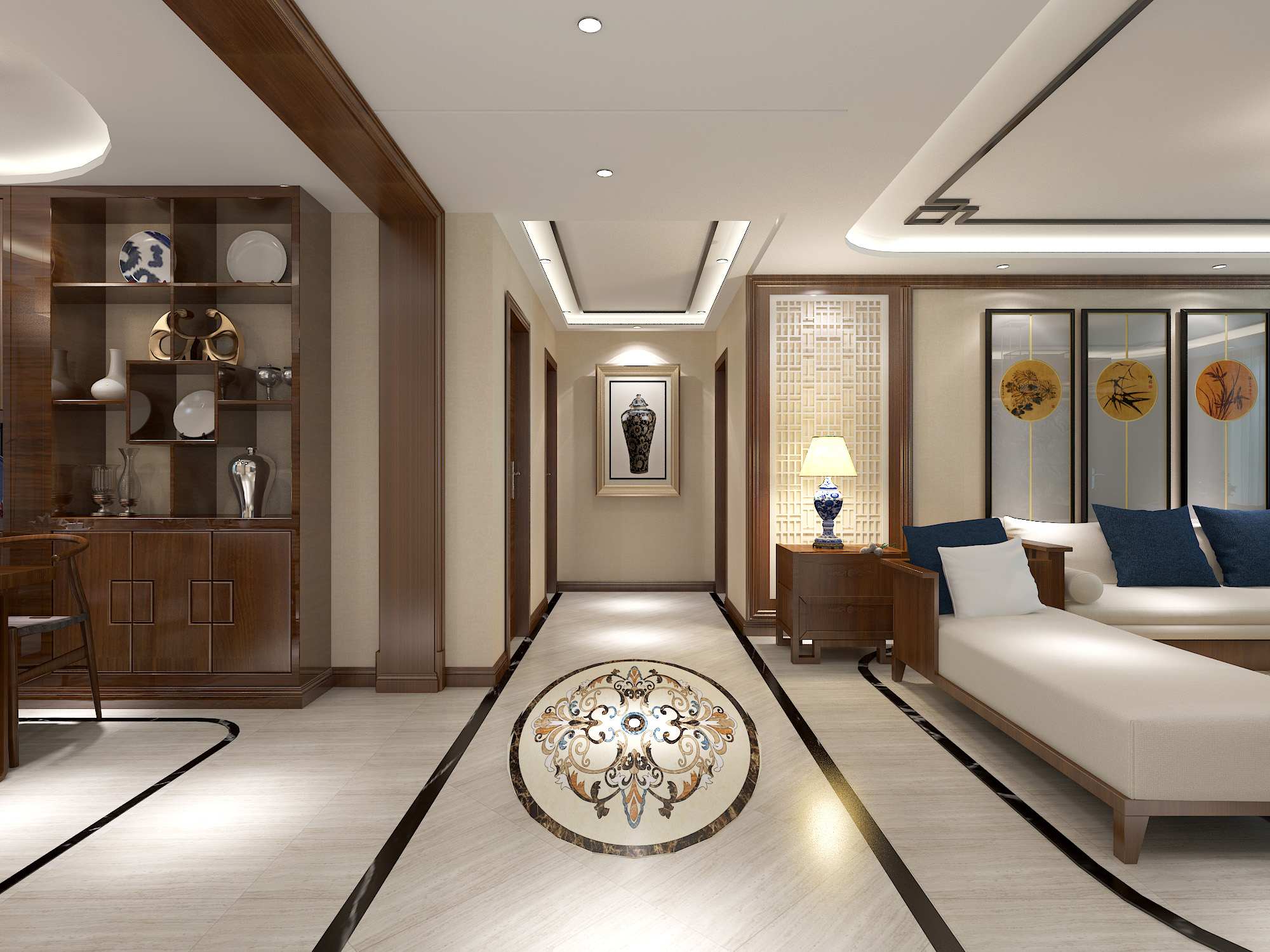 本案中的145平米的四居室整體采用了中式風(fēng)格裝修,過對傳統(tǒng)文化的解讀,將現(xiàn)代元素與傳統(tǒng)元素結(jié)合,以現(xiàn)代人的審美需求來打造富有傳統(tǒng)韻味的細節(jié)。風(fēng)塵俱靜,禪味悠長。